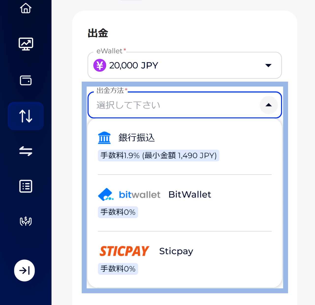 ④金額は、ご希望の出金金額を入力します。最小出金額は、5,000JPY(50USD、50EUR)で、1回あたりの出金上限額の制限はございません。
